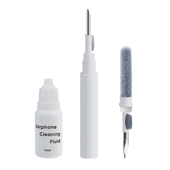 Setet utgörs av en metallspets till att ta bort smuts som sitter fast, en borste för hål och spår, samt en svamp som kan nå ner i fördjupningarna i ditt laddningsetui. Härutöver får du en liten flaska rengöringsvätska som hjälper till att lösa upp och ta bort smutsen.