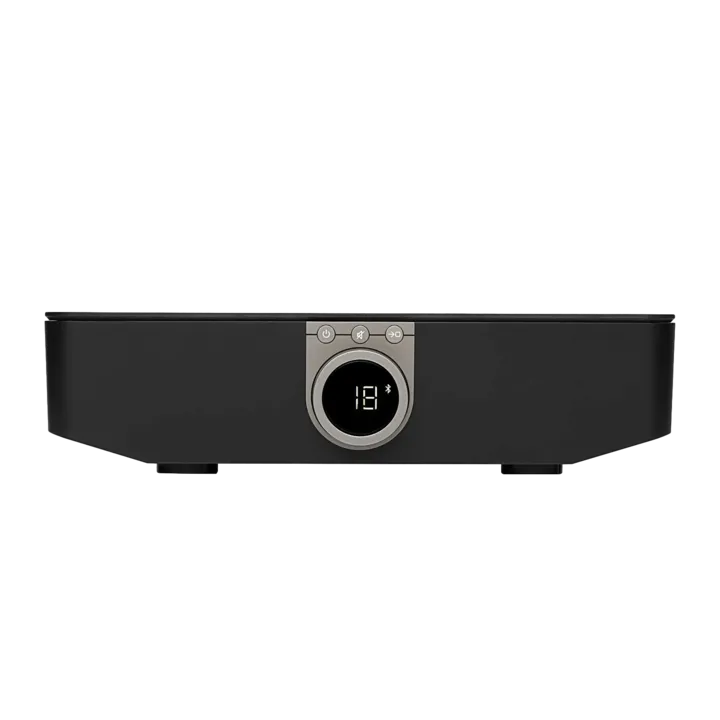 SOUND HUB finns med svart finish. Bluetooth-baserad fjärrkontroll medföljer. Bluesound- och HDMI/surround-modul är extra tillbehör.