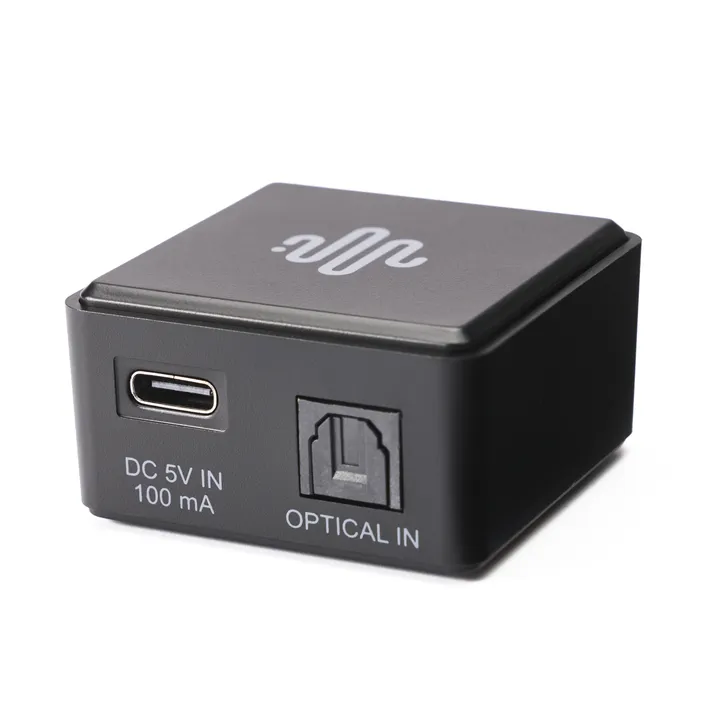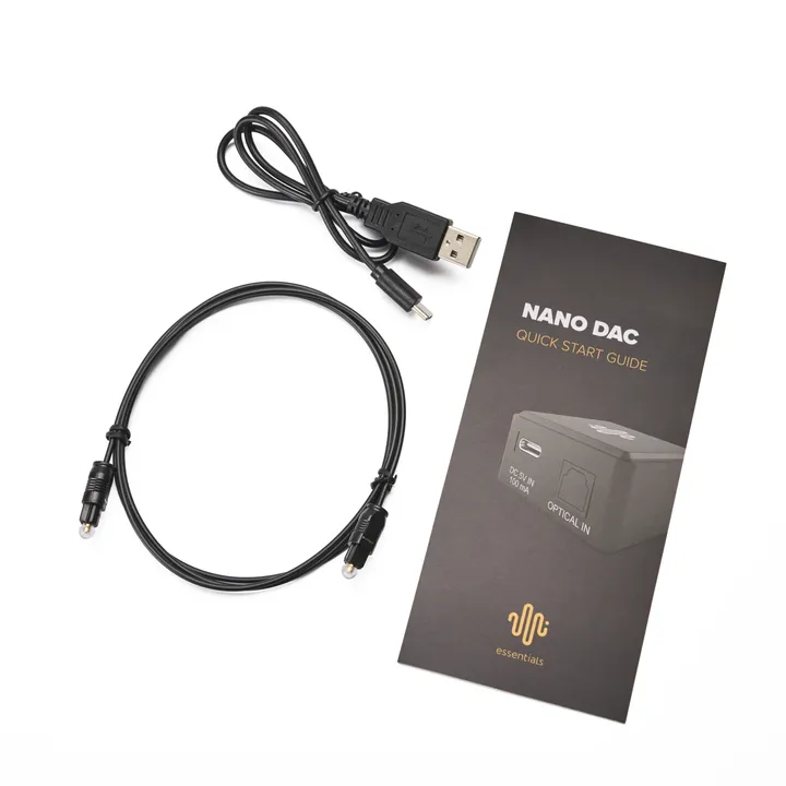 Essentials NanoDac finns i svart utförande. USB-A till USB-C-kabel och optisk kabel medföljer.
