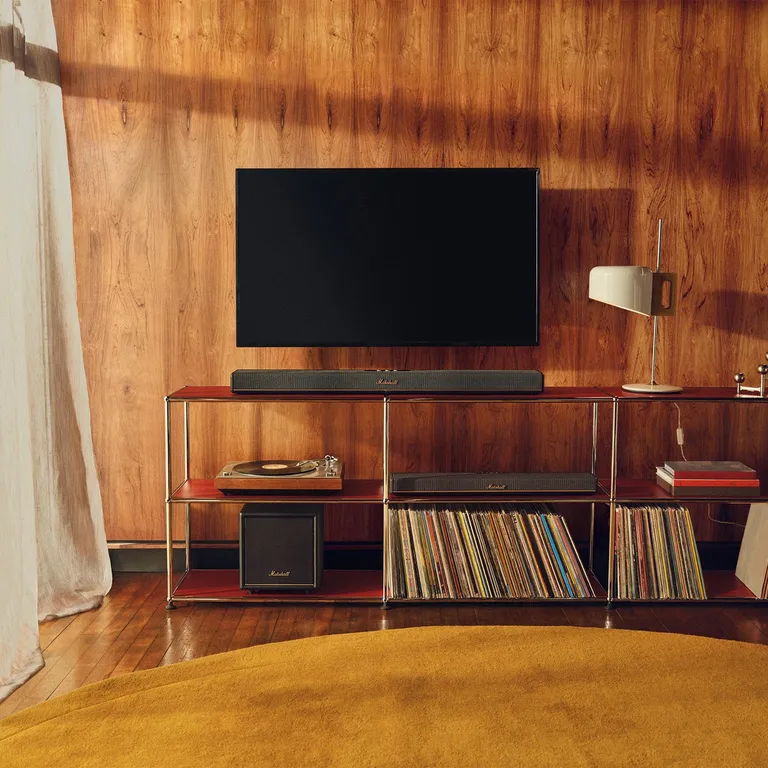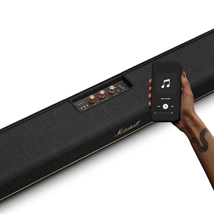 Heston 120 stödjer nästintill alla tänkbara ljudformat, inklusive Dolby Atmos och DTS:X som också ger dig en höjdkänsla i ljudbilden. I den dedikerade Marshall-appen kan du anpassa ljudet efter din personliga smak, på/av fungerar automatiskt, och via HDMI reglerar du ljudstyrkan via din TV:s fjärrkontroll, så den dagliga användningen flyter på precis som vanligt. Allt sker automatiskt.