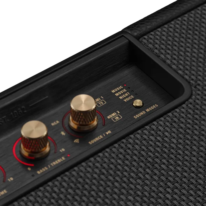 Heston 120 har lättillgängliga fysiska knappar för ingångsval, bas/diskant samt fyra fasta ljudinställningar för film, musik, röster och Night Mode. Sistnämnda är anpassad för lyssning på kvällen när du inte vill störa omgivningen mer än absolut nödvändigt. De snygga fysiska knapparna är en läcker och användarvänlig detalj som i hög grad bidrar till högtalarens ikoniska Marshall-look.