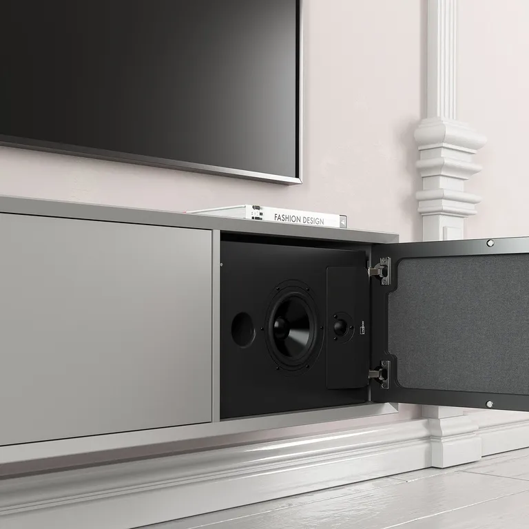 - Särskilt avsedd för att placeras horisontellt på en hylla i en TV-möbel (bakom tyglucka)