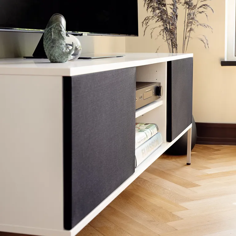 Tack vare de dansktillverkade unnu-möblerna behöver du inte längre avstå från att skaffa din drömanläggning bara för att du eller din bättre hälft inte vill behöva titta på elektronik och högtalare i vardagsrummet. Här får du nämligen möjlighet att gömma undan hela anläggningen – inklusive ett par medelstora högtalare och en subbas – bakom eleganta tygluckor som låter både ljud och fjärrkontrollssignaler passera. Du får din anläggning – och din bättre hälft slipper se den!