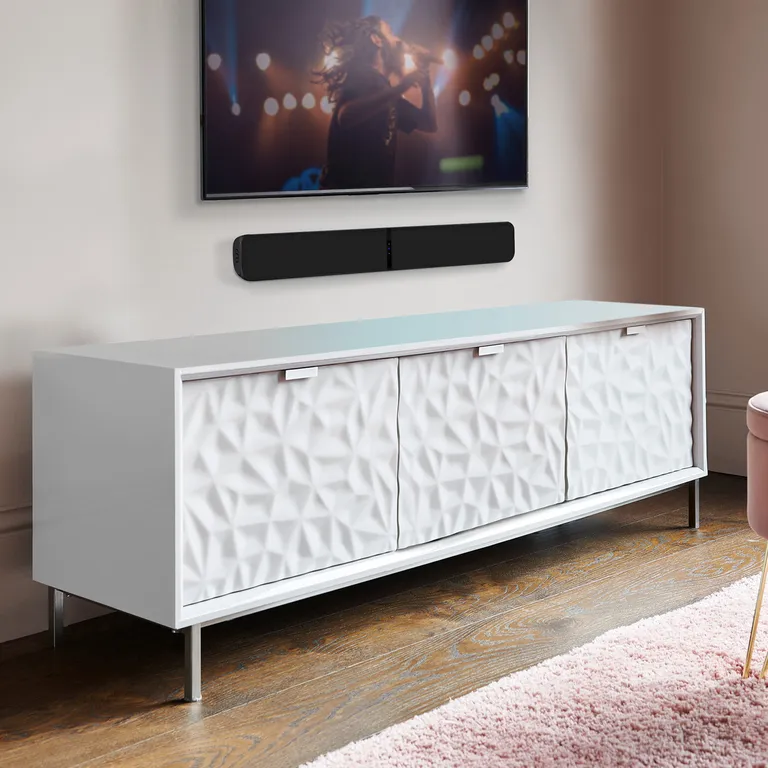 PULSE SOUNDBAR+ finns i svart eller vitt utförande. Fötter och väggfäste medföljer.