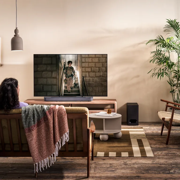 De pyttesmå högtalare som är inbyggda i Bravia 5 kan helt enkelt inte leva upp till den fina bilden. Om du vill ha den fulla upplevelsen till film, serier, sport, konserter och gaming så ska du ha en riktig hifi-lösning, och som tur är finns det både smidiga och prisvänliga sådana. Anslut ett par bra aktiva högtalare, en musikanläggning eller en riktig Dolby Atmos-hemmabio via HDMI eARC och upplev en realistisk ljudbild med djup, klarhet och detaljer – precis som skaparna tänkt sig den.