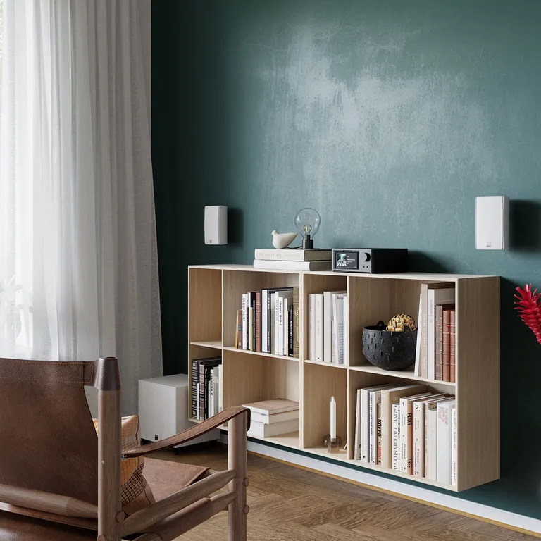 FAZON MIKRO är så liten att den utan problem smälter in diskret i alla interiörer. Fästet som medföljer ger en montering ända in mot väggen, så att lösningen ger ett väldigt rent intryck. Om du hellre vill ställa högtalaren på en hylla så använder du bara gummifötterna som medföljer.