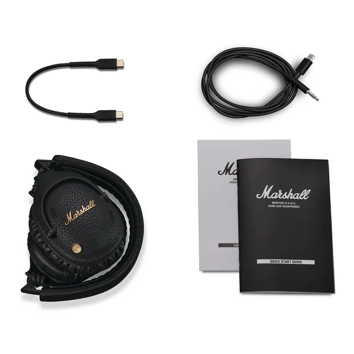 Marshall Monitor III A.N.C. Finns med svart finish. USB-C-kabel för laddning, ljudkabel och hardcase-transportetui med Marshall-logga medföljer.