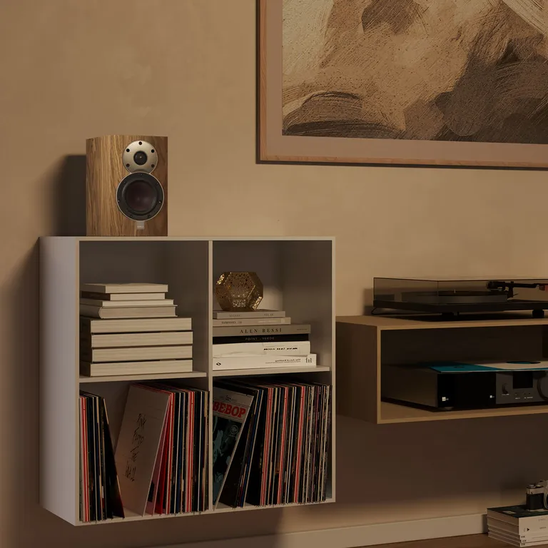 MENUET SE har utformats för en placering tätt intill väggen, antingen stående på en hylla eller upphängd med DALIs smarta väggfästen (extrautrustning). Högtalaren har finjusterats för denna placering så du behöver inte vara rädd för att du ska få en rungande och diffus bas. I ett mindre rum klarar sig MENUET SE alldeles utmärkt på egen hand. I ett stort vardagsrum kan du komplettera med en bra subbas så att du får ett högpresterande, kompakt högtalarsystem som täcker hela registret.