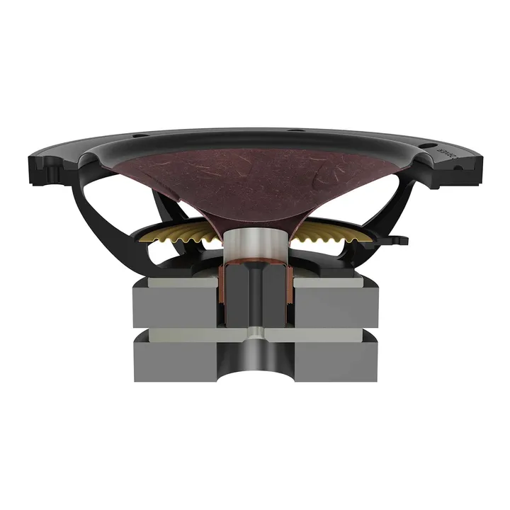 Bortsett från det lite enklare magnetsystemet bygger bas/mellanregister-elementen i RUBIKORE i mångt och mycket på samma teknik som du hittar i DALIs dyrare High End-serier. Det gjutna aluminiumchassiet är aerodynamiskt utformat och tillåter extrema membranrörelser utan luftkompression. Samtidigt ger den speciella blandningen av träfiber och papp ett styvt och lättrörligt membran utan resonansproblem.