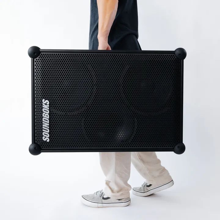 SOUNDBOKS 4 är konstruerad för att palla trycket. Högtalaren klarar både regn, snö, öl och extrem värme och kyla. Den solida konstruktionen i plywood och metall gör att den tål stryk och spelar på oavsett om någon välter den, tappar den eller kör över den. Hörnen är gjorda av stötdämpande silikonkulor som både skyddar högtalaren och ger en tyngre bas. Ännu en finess är att du känner basen dunka i handtagen när du flyttar festen till en ny plats.