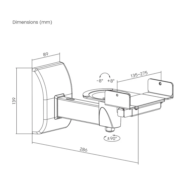 WB Swivel 15 kan vridas i både det vågräta och lodräta planet. Plattformen kan lutas upp till 10 grader nedåt och vridas upp till ±90 grader vågrätt så att du får en helt optimal vinkling i förhållande till din lyssningsposition. Fästena kan bära upp till 15 kg och passar därmed de flesta kompakta högtalare.