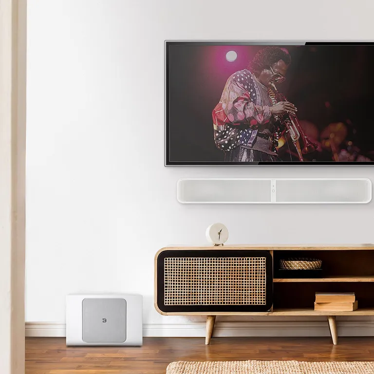 Bluesound PULSE SUB+ är ytterst kompakt för att vara en subbas, och med sin tunna design ger den dig massor av flexibla placeringsmöjligheter, exempelvis liggande under en soffa eller hängande på väggen (väggfäste medföljer).