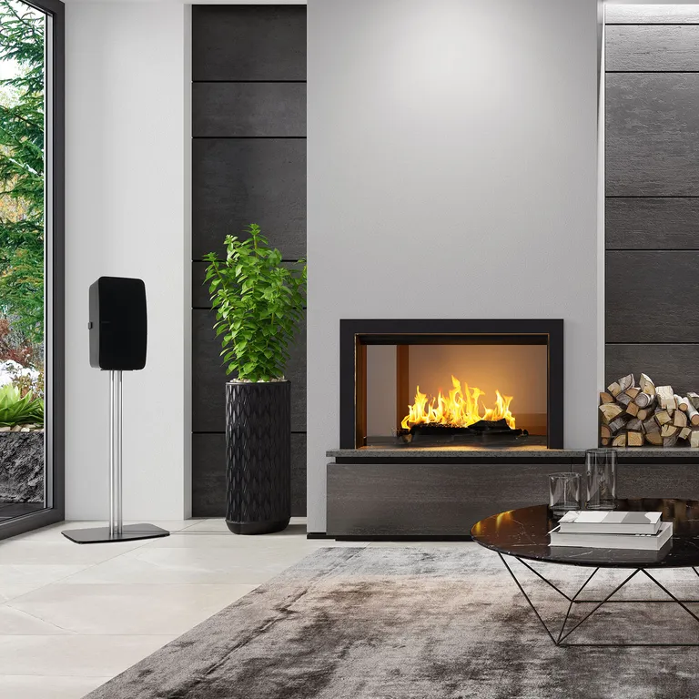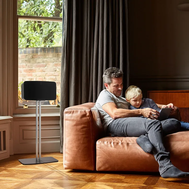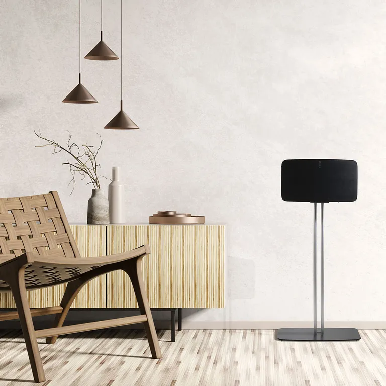 Mountson Premium Floor Stand for Sonos Five & Play:5 är ett specialdesignat golvstativ för fristående placering av de trådlösa högtalarna Sonos Five och Play:5. Med det här stativet kan du placera högtalaren fritt i vardagsrummet i lämplig lyssningshöjd för till exempel en Sonos-hemmabio eller när du lyssnar på musik vid matbordet.