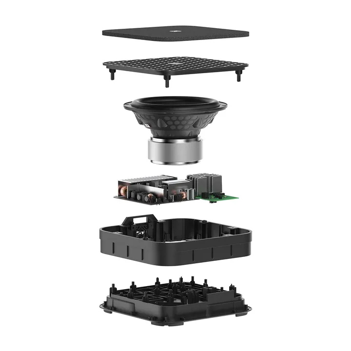 AMBEO Sub har en diskret design i mattsvart finish, så den drar inte till sig onödig uppmärksamhet i ditt vardagsrum, samtidigt som du slipper att dra en osnygg kabel från din soundbar. Det starka long-throw-elementet på 8 tum drivs av en inbyggd förstärkare på 350 watt och du kan ansluta ända upp till fyra stycken AMBEO Sub till din AMBEO-soundbar. Så du kan få det precis hur grymt du vill, även i ett stort vardagsrum.