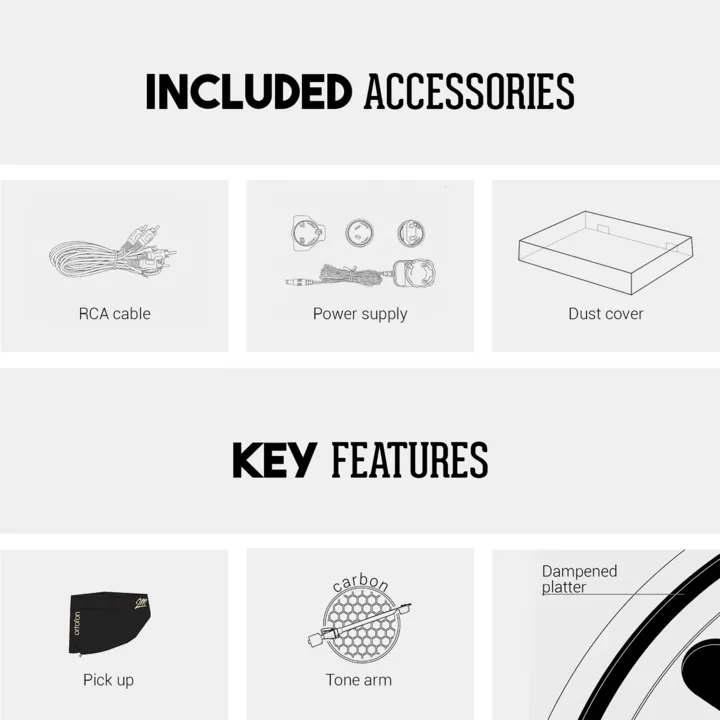 Kablarna till pickupen är tillverkade i exklusiv OFC-koppar och skivtallriken är dämpad med gummi på undersidan så att den nästan blir helt resonansdöd. De sista spåren av resonans kvävs av skivmattan som också är i gummi istället för gängse filtmatta.
