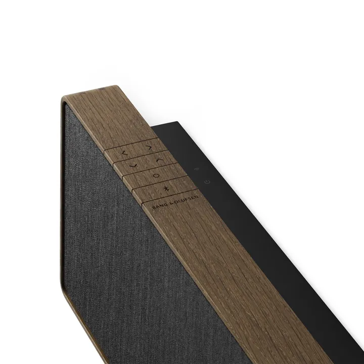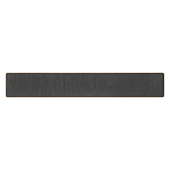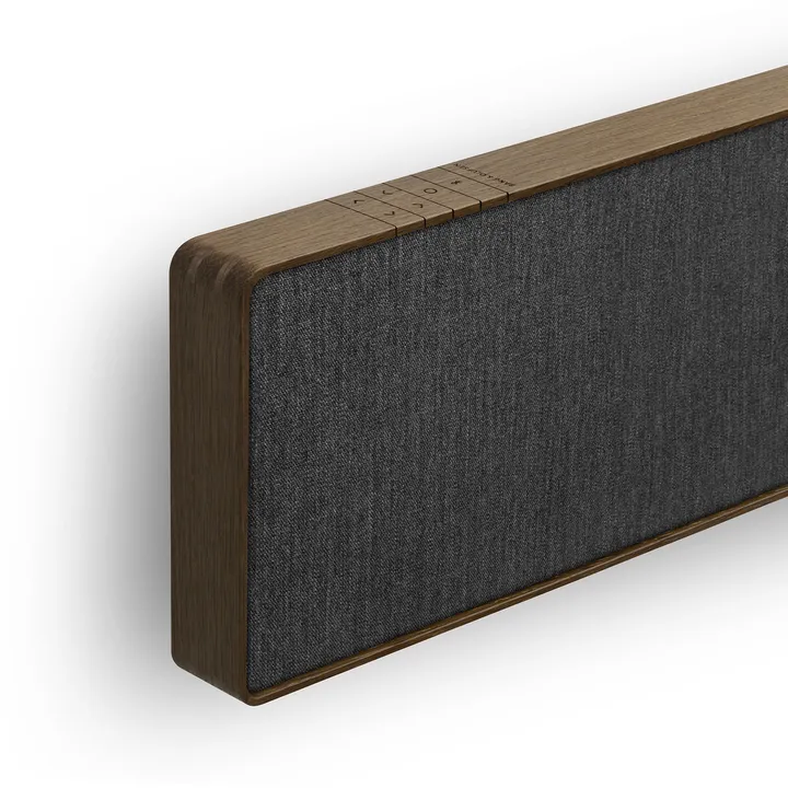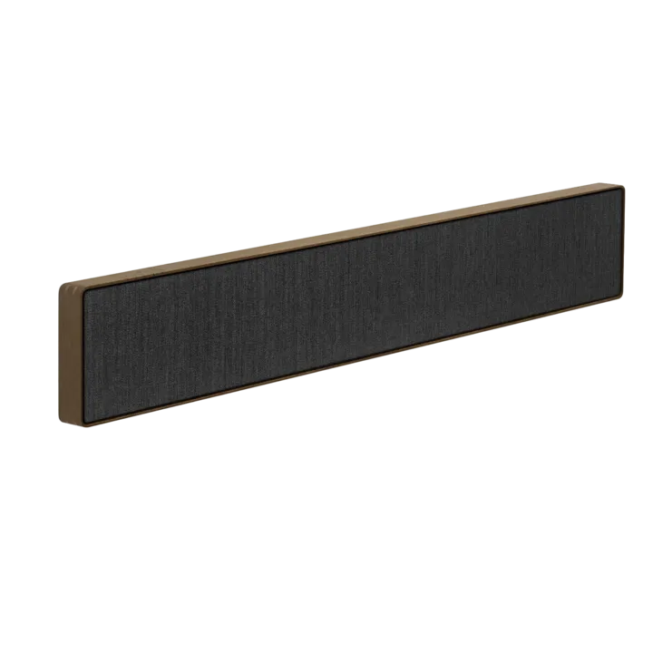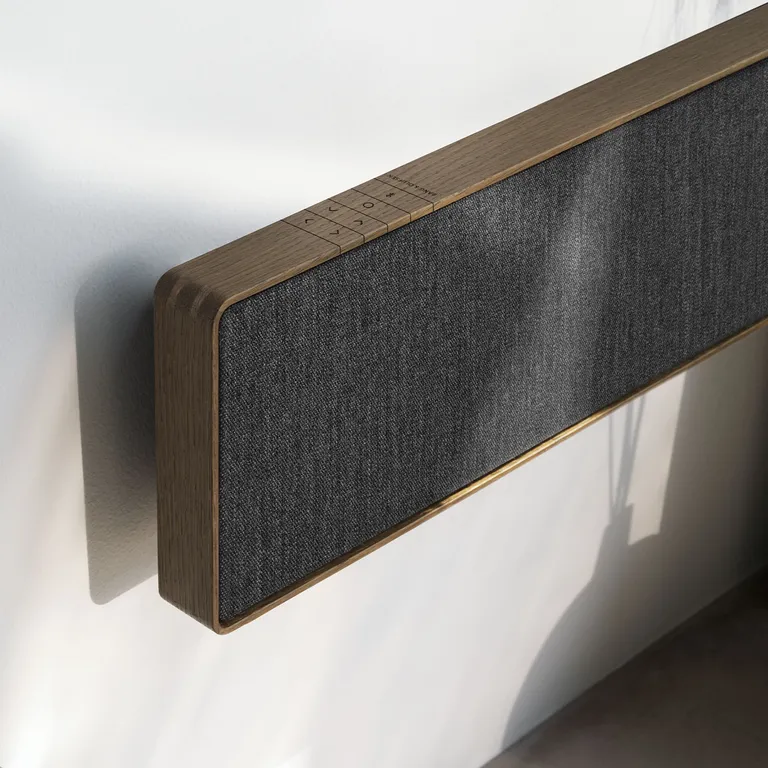 Beosound Stage har en bredd på solida 110 cm, men tack vare en slank och diskret design verkar den alltid förbluffande kompakt och elegant, oavsett om den hänger på väggen eller ligger vågrätt på en TV-möbel. Ramen är tillverkad i äkta aluminium eller trä, och det exklusiva fronttyget från Kvadrat (på Bronze Tone/Smoked Oak) fulländar bilden av en produkt i högsta kvalitetsklass.