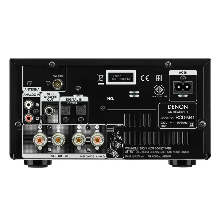 Den inbyggda stereoförstärkaren i RCD-M41 håller hög klass och är stark nog att få fram ett bra ljud ur ett par riktiga hifi-högtalare. Till anläggningarna på elektronikvaruhusen ingår nästan alltid ett par högtalare, men låt dig inte luras av det. De är så gott som alltid gjorda av billig plast och låter förskräckligt. Ofta ser de också så skröpliga ut att du måste blunda – och då är det inte av njutningsfulla musikupplevelser du sluter ögonen. Och du kan lita på att du till på köpet har fått betala för dem!
