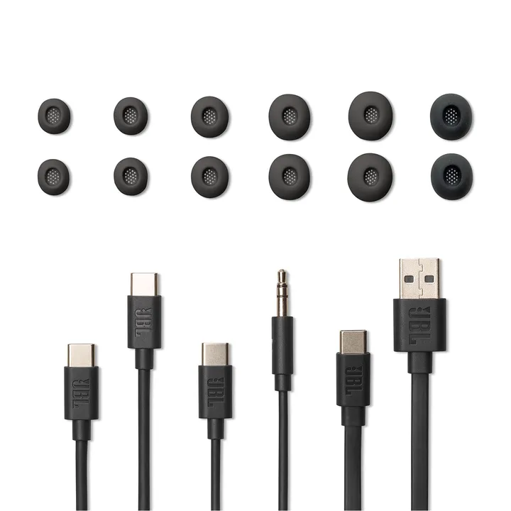 JBL Tour Pro 3 finns i flera färger. Laddningsetui, USB-C-kabel för laddning, minijack-till-USB-C-ljudkabel och 5 par öronadaptrar i olika storlekar, samt 1 par skumadaptrar medföljer.