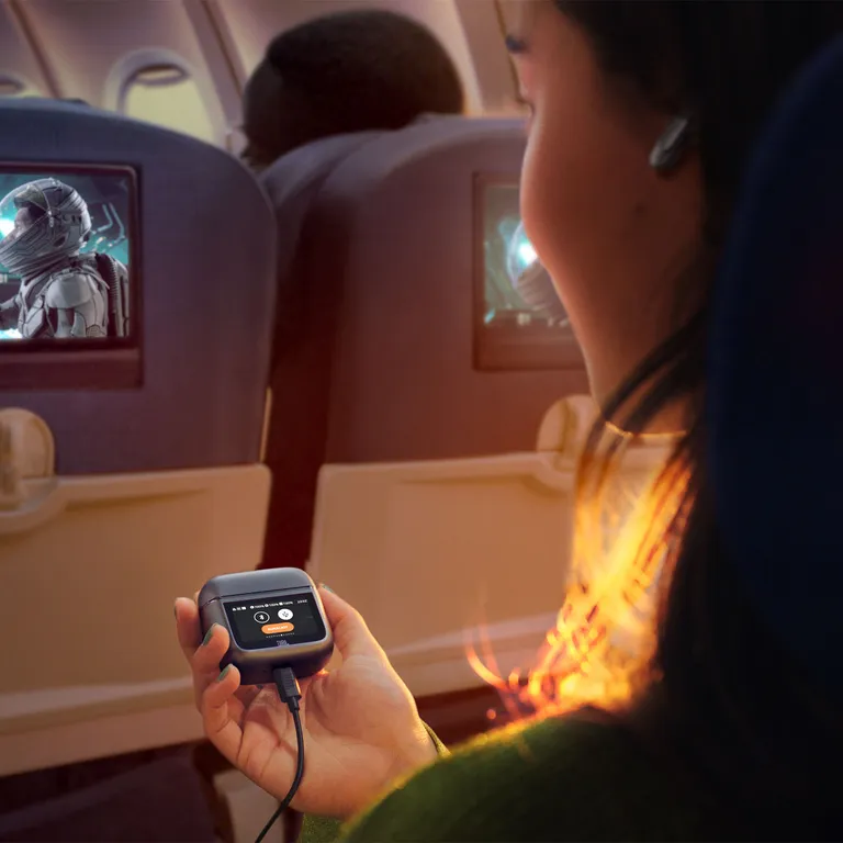 Som en läcker och väldigt användbar detalj kan du ansluta en extern ljudkälla till laddningsetuiet via någon av minijack- eller USB-C-kablarna som medföljer. Laddningsetuiet ordnar då så att signalen skickas vidare till öronsnäckorna. Det betyder att du även kan njuta av bra ljud med full trådlös frihet och Smart Noise Cancelling medan du jobbar på din laptop eller ser en film via planets underhållningssystem under en långflygning.
