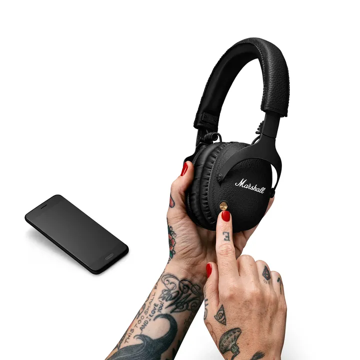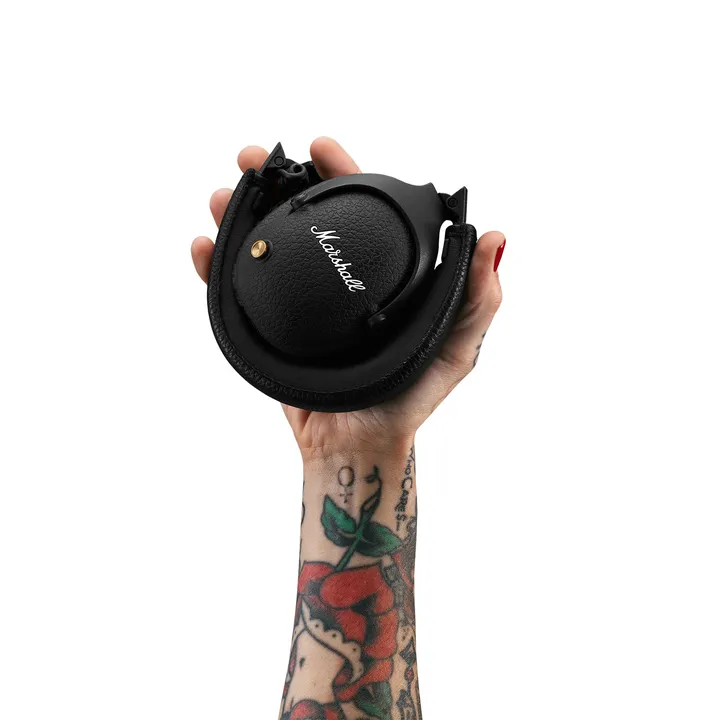 Monitor II A.N.C. har en läcker design med den ikoniska vita Marshall-loggan på sidan av de sköna öronkåporna, och utseendet på de svarta ytorna är hämtat direkt från Marshalls legendariska gitarrförstärkare. Den vadderade huvudbygeln ser till att du skönt kan lyssna dig igenom även de längsta flygresorna, och om du skulle behöva en paus i musiklyssningen kan du blixtsnabbt fälla ihop hörlurarna och stoppa dem i ryggsäcken.