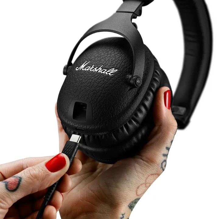 Marshall Monitor II A.N.C. Finns med svart finish. USB-C-kabel för laddning, ljudkabel och transportpåse med vit Marshall-logga medföljer.